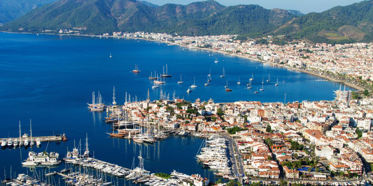 Batıdan Reşadiye Yarımadası ve Kerme Körfezi, kuzeyden Muğla, doğudan Balan Dağı, Karadağ ve Günlük Tepeleri ile, güneyden denizle çevrilmiştir. Körfezin önünde kıyıya ince bir dille bağlı olan Adaköy, onun önünde Bedir Adası, Keçi Adası ve Güvercin Adası bulunur.Kentin en eski kısımı denize doğru uzanmış kalker yapılı bir tepe üzerine kurulmuş olan Kale Mahallesidir. Marmaris daha sonra eteklere doğru ve kıyı boyunda gelişmiştir. Konumu, hem Marmaris'e hemde Marmaris'den diğer merkezlere, tarih ve doğa kokan güzelliklere ulaşılmasını kolaylaştırır. Hava ulaşımının yapıldığı Dalaman Havaalanı sadece bir saat uzaklıktadır.Görmek istediğiniz yerleri katılacağınız turlarla bir gün içinde gezebilir, akşam tekrar Marmaris'te tatilinize devam edebilirsiniz. Rodos ise sadece 45 dakika uzaklıktadır..
